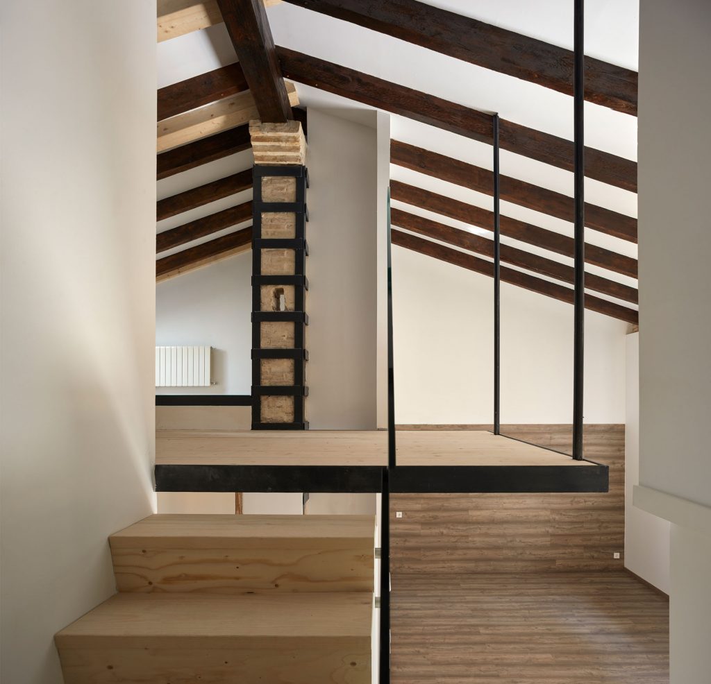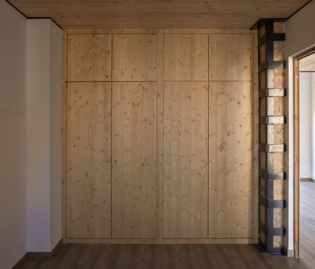 Este altillo se descuelga de las viguetas de madera del forjado inclinado, pero para su construcción primero tuvimos que reforzar las viguetas para que pudiesen soportar el peso de la estructura. Para ello, las sustituimos por unas de mayor envergadura, con estructura metálica de perfiles y tratadas en autoclave. Además, el forjado del altillo se realizó con madera CLT.