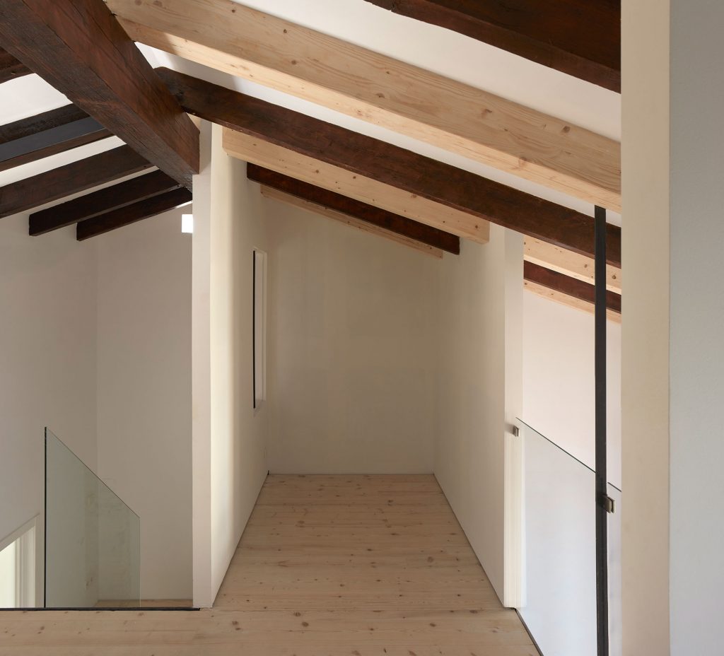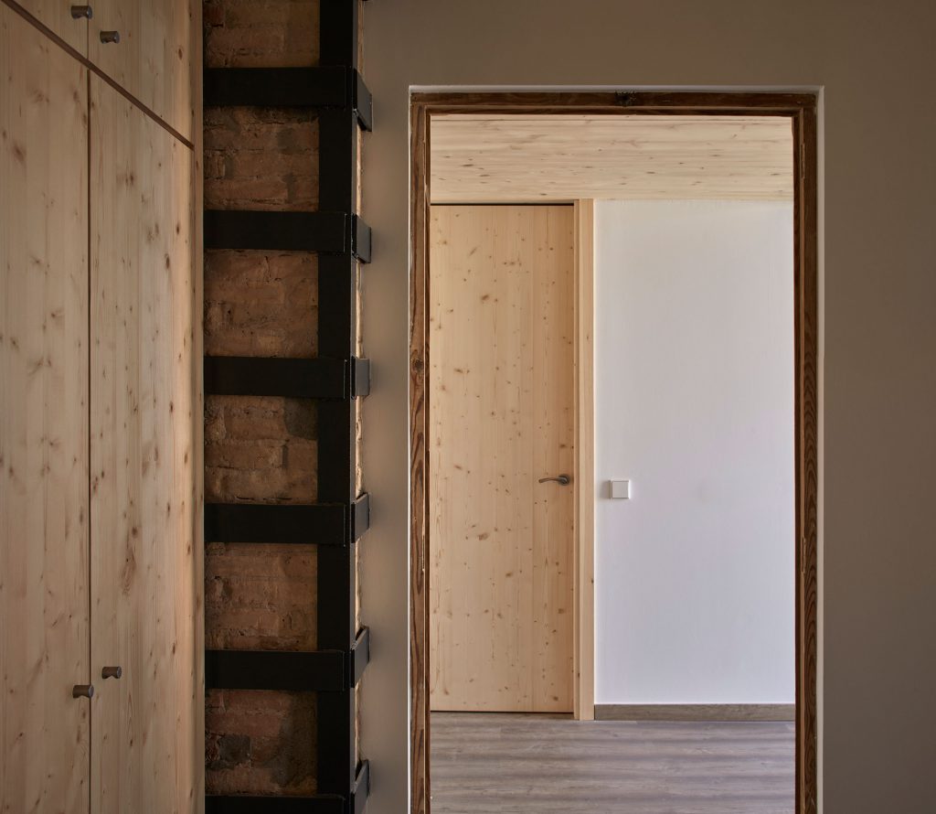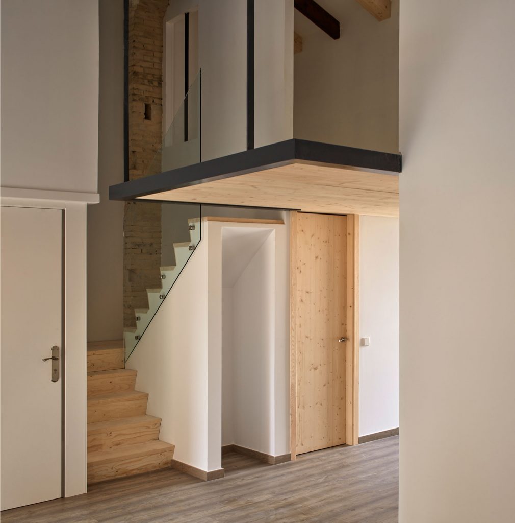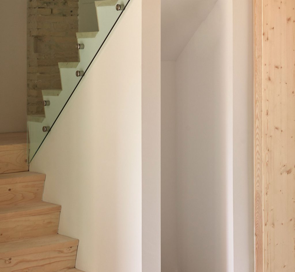Para mantener la presencia predominante de la madera, también utilizamos este material para la escalera de acceso a la planta superior, realizada en madera de pino melis; en las ventanas, de madera maciza con contraventanas abatibles del mismo material; y para el suelo, un suelo laminado de la casa Finsa